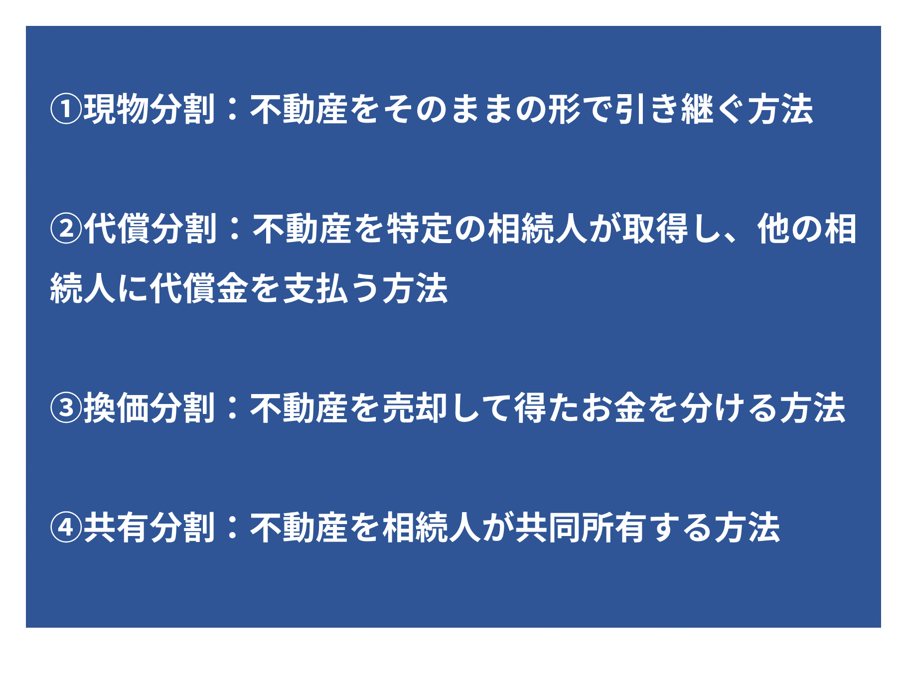 相続財産に不動産が含まれる場合には、以下の4つの分割方法があります。