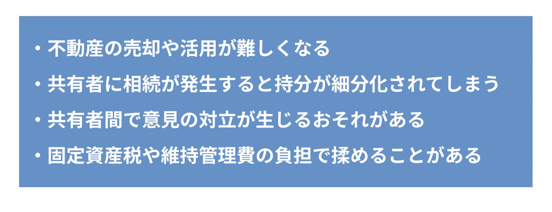 相続財産に不動産が含まれる場合、分割方法の一つとして「共有分割」がありますが、以下のようなリスクがあります。