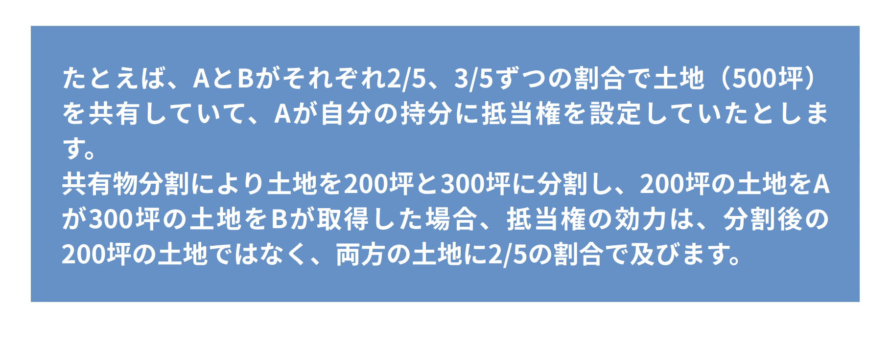 共有持分に抵当権が設定された後、共有物分割が行われた場合、抵当権は、分割後の持分だけではなくすべての不動産を対象として効力が及びます。
