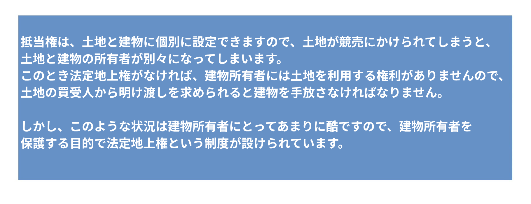 なお、強制競売や公売により土地と建物の所有者が別々になった場合は、抵当権設定の有無にかかわらず法定地上権が成立します。