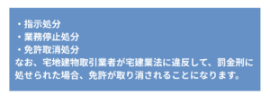 宅地建物取引業者が宅地建物取引業法に違反して、報酬告示の限度を超えて報酬を受けた場合、以下のような行政処分が科される可能性があります。