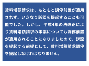 もっとも、賃料増額請求では、「調停前置」が適用されますので、賃料増額請求訴訟を提起する前提として、裁判所に賃料増額請求調停の申立てをしなければなりません。賃料増額請求の調停前置には、例外もありますので適用範囲をしっかりと押さえておくことが大切です。