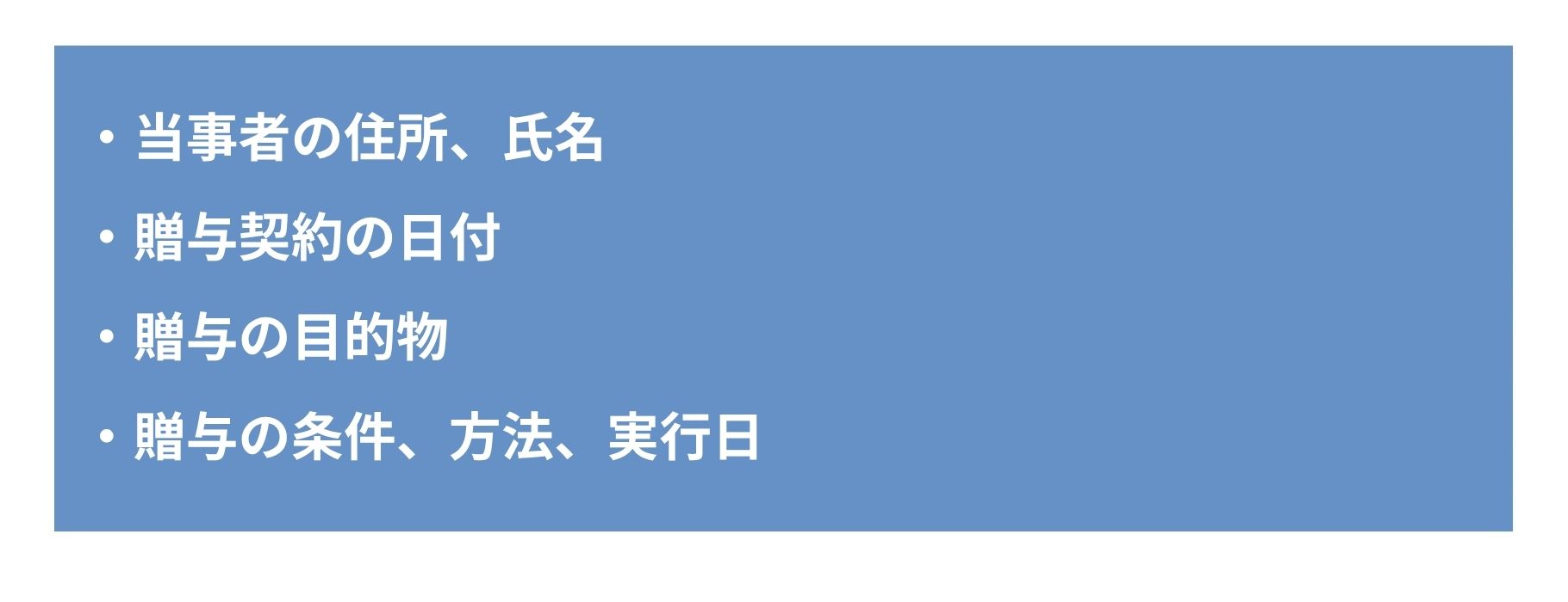 贈与契約書には特に決められた様式はありませんが、一般的には、以下のような事項を記載します。