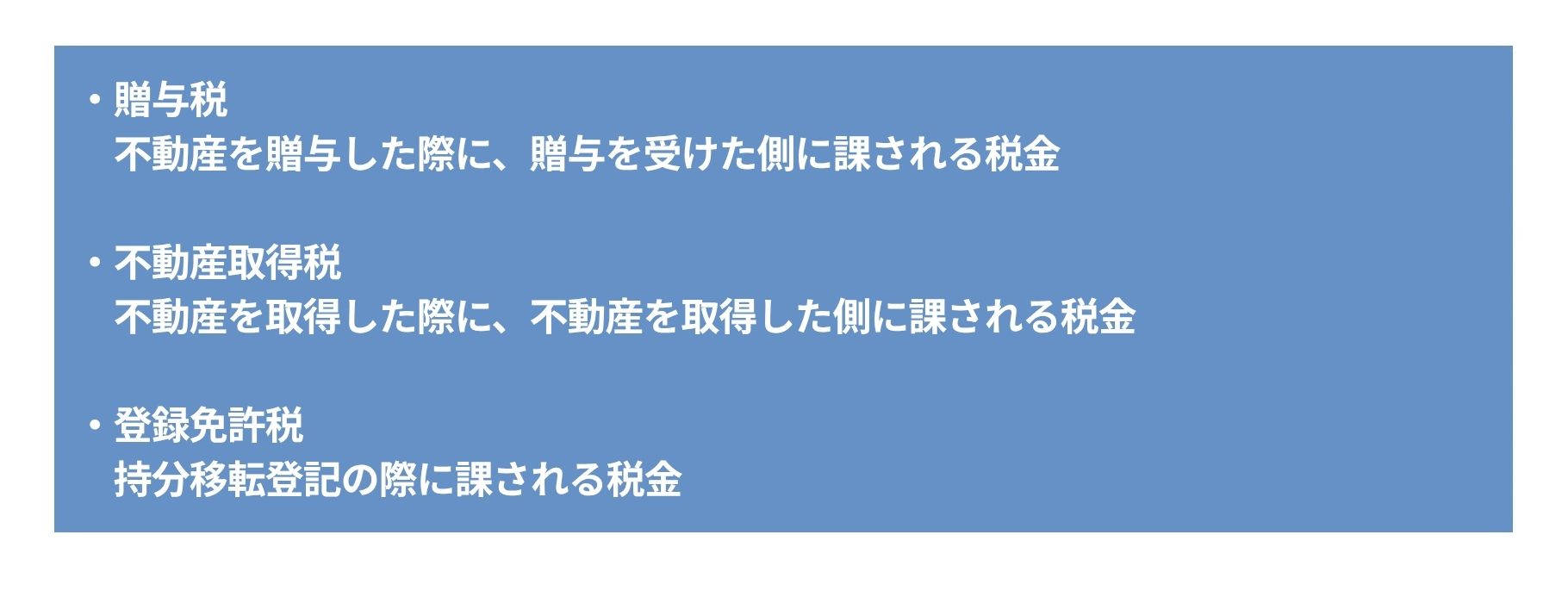 共有持分の贈与のデメリットでも説明したとおり、共有持分の贈与に伴い、以下のような税金が発生します。