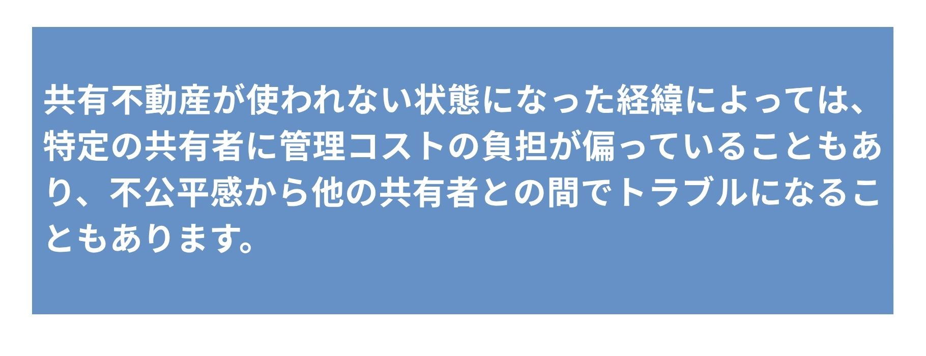 しかし、使われていない共有不動産の場合、共有不動産から得られる利益はほとんどないにもかかわらず、管理コストだけ負担しなければなりませんので、共有不動産の所有者にとっては大きな負担となるでしょう。