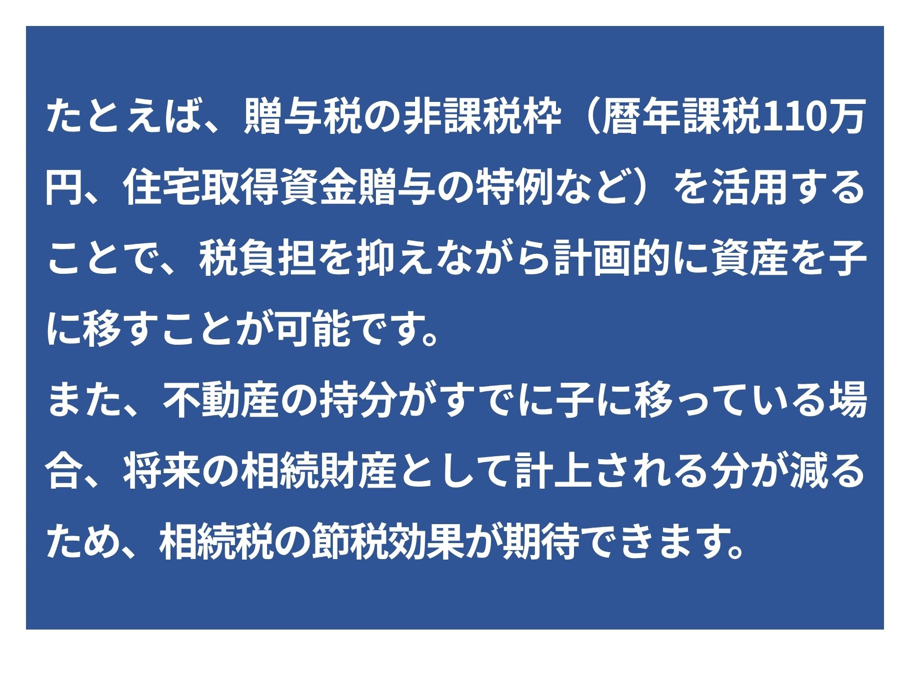 特に、不動産は評価額が大きくなりやすいため、贈与税の額も高額になりやすい点に注意が必要です。