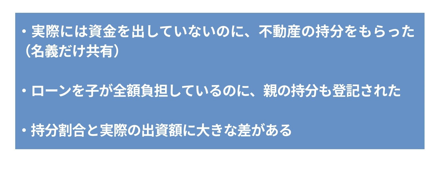 不動産を購入する際に、実際に出資していない親や子に持分を登記した場合、その部分については「贈与」とみなされるリスクがあります。