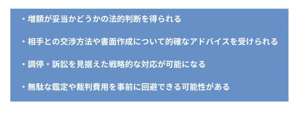 そのため、賃料増額を検討している段階から、不動産問題に詳しい弁護士に相談することを強くおすすめします。弁護士に相談することで、以下のようなメリットがあります。