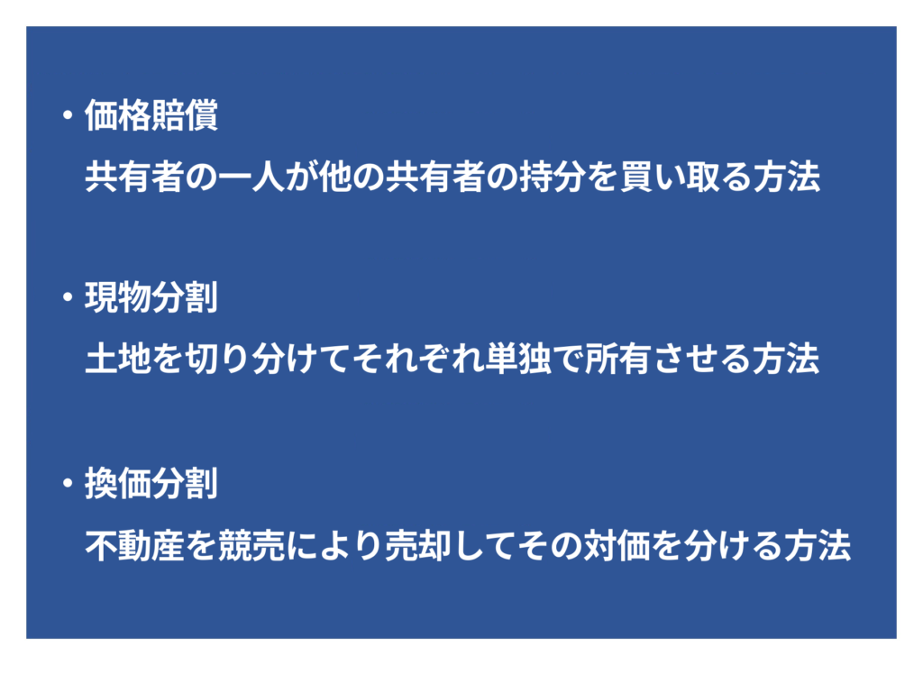 共有物分割請求訴訟では、裁判所が以下の方法により共有関係の解消を命じます。