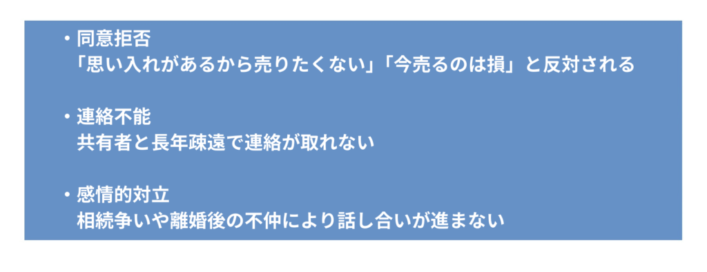 このように、共有名義であるがゆえに売却手続きが滞り、結果として「売れない状態」に陥ってしまうのです。