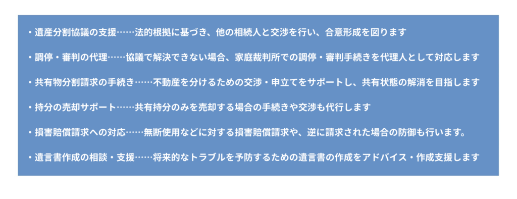 弁護士は、共有不動産をめぐる相続トラブルに対して、以下のような法的サポートを提供しています。