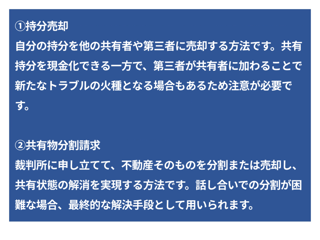 どうしても共有関係がうまくいかない場合には、抜本的な解決策として「持分売却」や「共有物分割」があります。