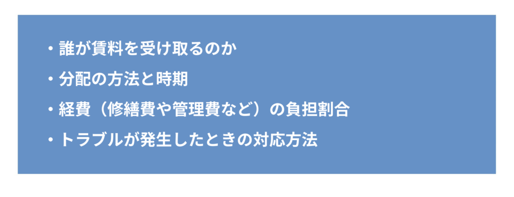といった具体的なルールを文書にしておくことで、後々の誤解や不信感によるトラブルを防ぐことができます。特に、親族間の共有では「暗黙の了解」で進めがちですが、お互いの認識の違いからトラブルに発展するケースも多いため、できる限り書面化をするべきでしょう。