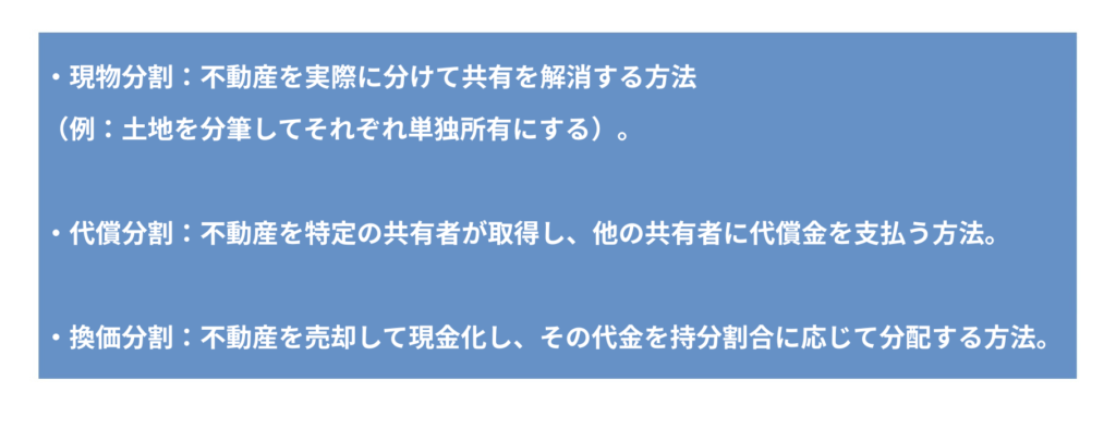 これは、共有状態を解消するために認められている法的手続きで、以下のような方法により共有状態を解消することができます。