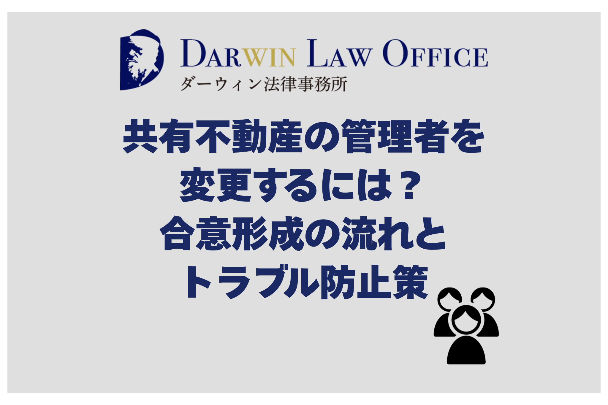 ダーウィン法律事務所では、共有不動産に関するトラブルや管理者変更手続きを多数サポートしており、法的に有効な合意書作成から共有者間の交渉、調停対応まで一貫して対応可能です。共有者間の関係を損なわず、円満に管理体制を整えたい方は、早めにダーウィン法律事務所へご相談ください。