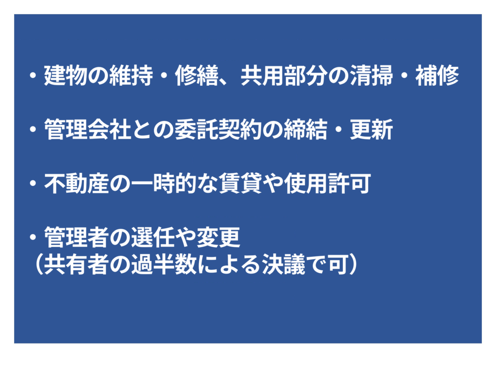 これらの行為は、共有者全員の合意を要せず、持分価格の過半数で決定できるため、実務上も柔軟に対応が可能です。