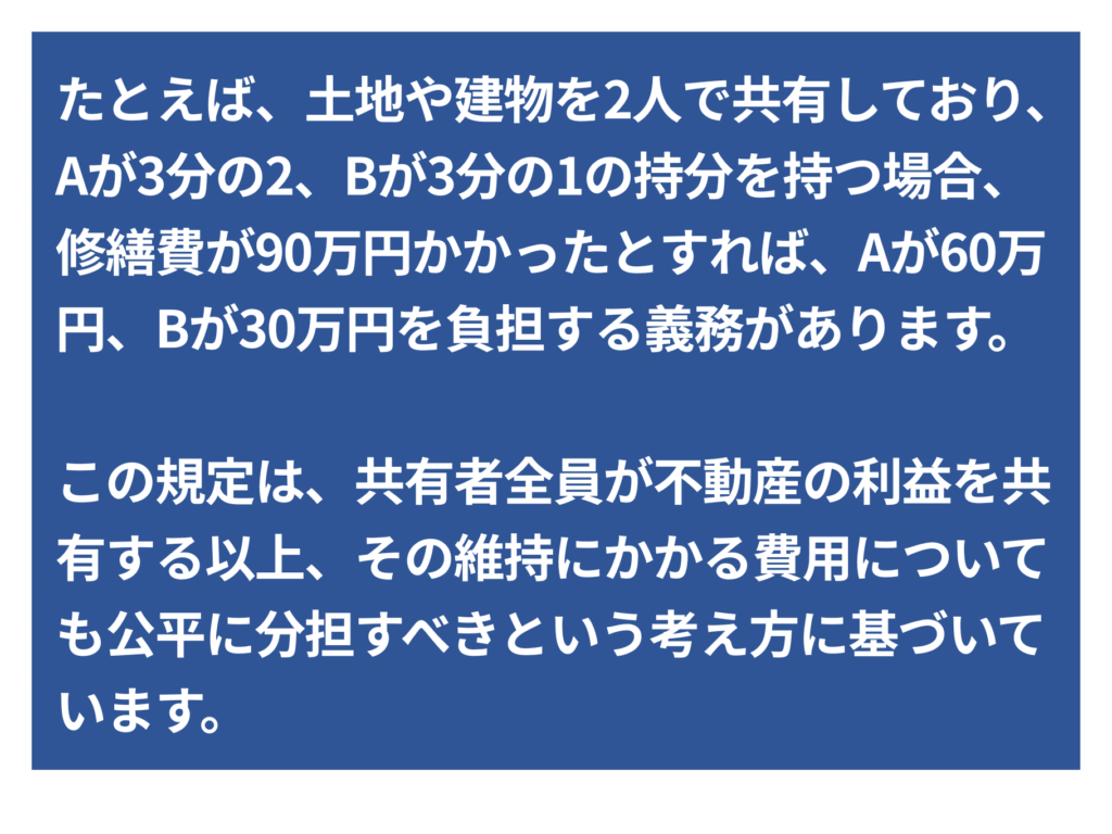 したがって、特別な取り決めがない限り、「持分割合に応じた負担」が基本ルールとなります。